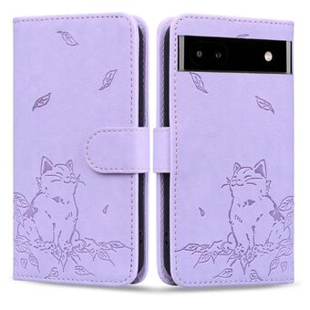 For Google Pixel 7a Cute Cat Embossed Leather Phone Case(Purple)