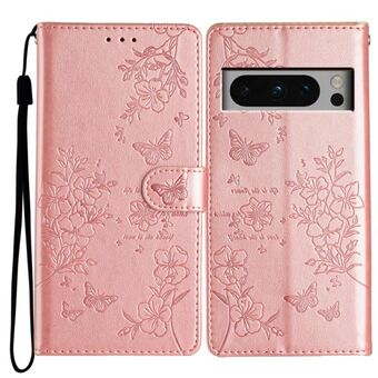 For Google Pixel 8 Pro Butterflies and Flowers Leather Phone Case(Rose Gold)