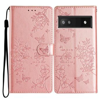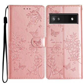 For Google Pixel 6a Butterflies and Flowers Leather Phone Case(Rose Gold)