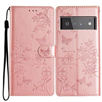 For Google Pixel 6 Pro Butterflies and Flowers Leather Phone Case(Rose Gold)