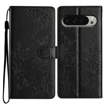 For Google Pixel 9 / 9 Pro Butterflies and Flowers Leather Phone Case(Black)