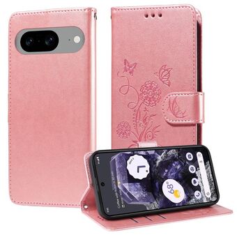 For Google Pixel 9a Butterflies and Flowers Leather Phone Case(Rose Gold)