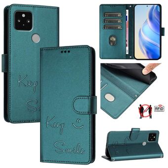 For Google Pixel 5 Smile Embossing RFID Leather Phone Case(Peacock Green)