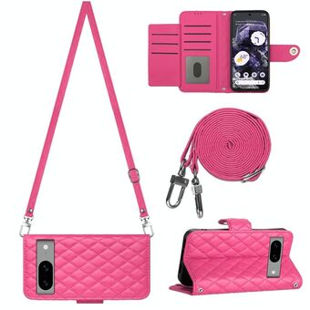 Για το Google Pixel 8a Ρομβική υφή Flip δερμάτινη θήκη τηλεφώνου με μακρύ κορδόνι (Rose Red)