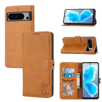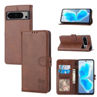 Για το Google Pixel 8 Pro ανάγλυφο ευτυχισμένη γάτα μοτίβο Flip δέρμα υπόθεση τηλεφώνου (καφέ)