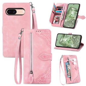 Για το Google Pixel 8a ανάγλυφο λουλούδι φερμουάρ δερμάτινη θήκη τηλεφώνου (ροζ)