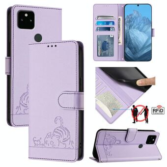 For Google Pixel 5a 5G Cat Rat Embossed Pattern RFID Leather Phone Case with Lanyard(Purple)