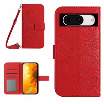 Για το Google Pixel 8 Skin Feel Sun Flower ανάγλυφο ανάγλυφο Flip δέρμα υπόθεση τηλεφώνου με κορδόνι (κόκκινο)