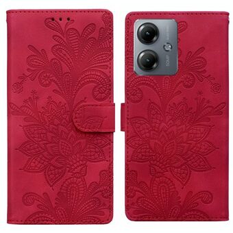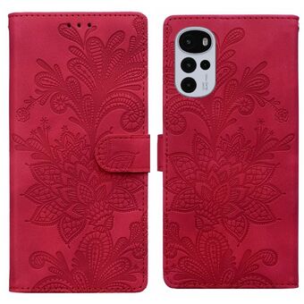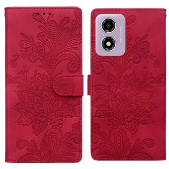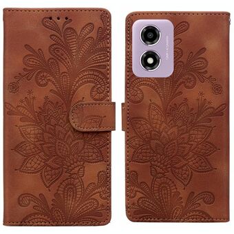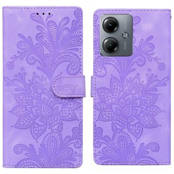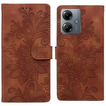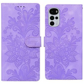 Θήκη τηλεφώνου από PU με μαγνητικό κούμπωμα και λουρί καρπού, με δαντελένιο λουλουδάτο ανάγλυφο σχέδιο για Motorola Moto G04 / E14 / G24 (Μωβ)