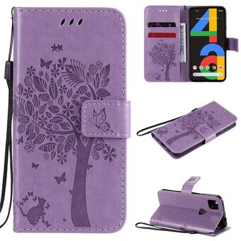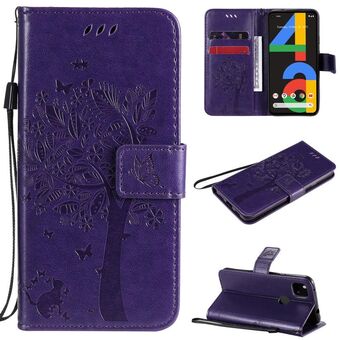 For Google Pixel 4a 4G Tree & Cat Embossed Pattern Horizontal Flip Leather Case with Holder & Card Slots & Wallet & Lanyard(Purple)