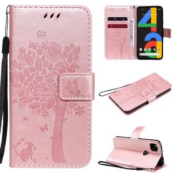For Google Pixel 4a 4G Tree & Cat Embossed Pattern Horizontal Flip Leather Case with Holder & Card Slots & Wallet & Lanyard(Rose Gold)