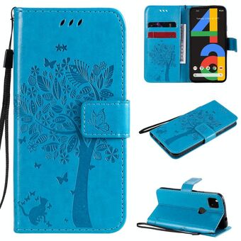 For Google Pixel 4a 4G Tree & Cat Embossed Pattern Horizontal Flip Leather Case with Holder & Card Slots & Wallet & Lanyard(Blue)