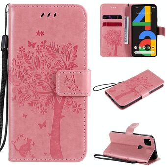 For Google Pixel 4a 4G Tree & Cat Embossed Pattern Horizontal Flip Leather Case with Holder & Card Slots & Wallet & Lanyard(Pink)