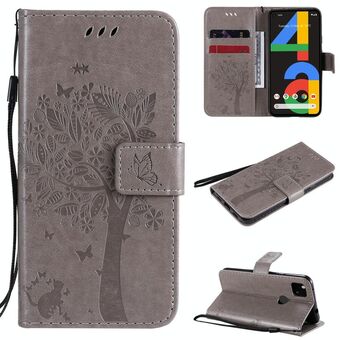 For Google Pixel 4a 4G Tree & Cat Embossed Pattern Horizontal Flip Leather Case with Holder & Card Slots & Wallet & Lanyard(Grey)
