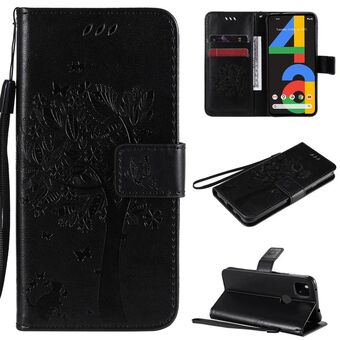 For Google Pixel 4a 4G Tree & Cat Embossed Pattern Horizontal Flip Leather Case with Holder & Card Slots & Wallet & Lanyard(Black)