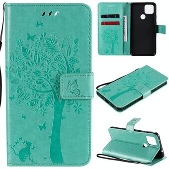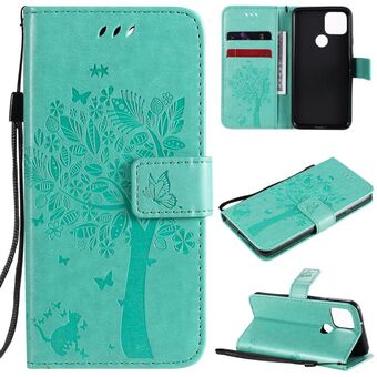 For Google Pixel 4a 5G / Pixel 5 XL Tree & Cat Embossed Pattern Horizontal Flip Leather Case with Holder & Card Slots & Wallet & Lanyard(Green)