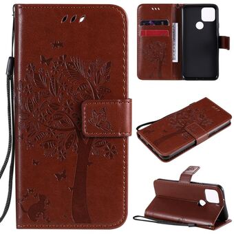 For Google Pixel 5 Tree & Cat Embossed Pattern Horizontal Flip Leather Case with Holder & Card Slots & Wallet & Lanyard(Coffee)