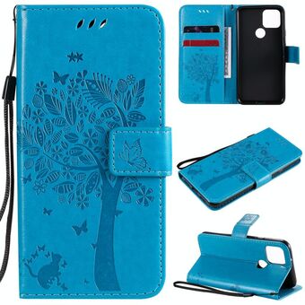For Google Pixel 5 Tree & Cat Embossed Pattern Horizontal Flip Leather Case with Holder & Card Slots & Wallet & Lanyard(Blue)
