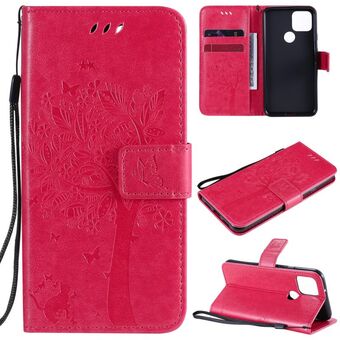 For Google Pixel 4a 4G Tree & Cat Embossed Pattern Horizontal Flip Leather Case with Holder & Card Slots & Wallet & Lanyard(Rose Red)