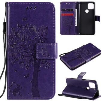 For Google Pixel 5 Tree & Cat Embossed Pattern Horizontal Flip Leather Case with Holder & Card Slots & Wallet & Lanyard(Purple)