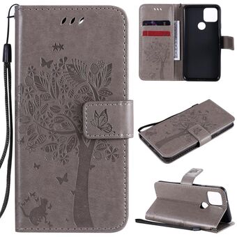For Google Pixel 5 Tree & Cat Embossed Pattern Horizontal Flip Leather Case with Holder & Card Slots & Wallet & Lanyard(Grey)
