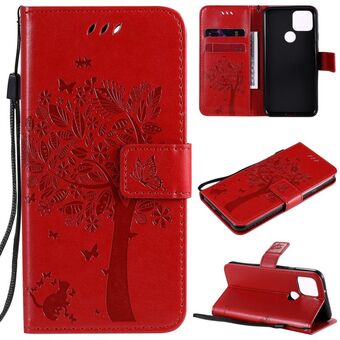For Google Pixel 5 Tree & Cat Embossed Pattern Horizontal Flip Leather Case with Holder & Card Slots & Wallet & Lanyard(Red)