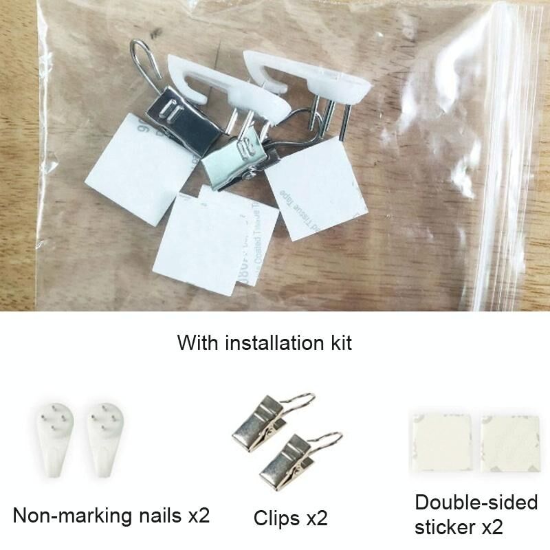 7. Λίστα συσκευασίας: ύφασμα φόντου x1, καρφιά χωρίς σημάδια x2, κλιπς x2, αυτοκόλλητα διπλής όψης x2