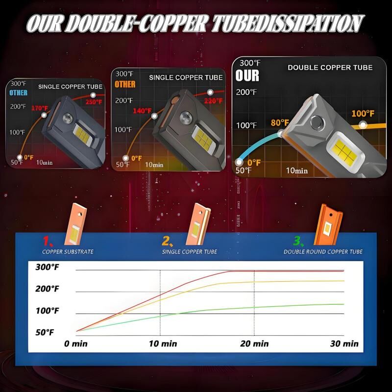 3. The lamp bead substrate consists of two copper sheets + two copper tubes. The copper sheet and the copper tube have better thermal conductivity, achieving double-sided thermal conductivity. The substrate is closely combined with the aluminum lamp body and fully contacted, which can quickly and efficiently transfer the temperature of the lamp bead to the bottom fan, greatly improving the heat dissipation effect.