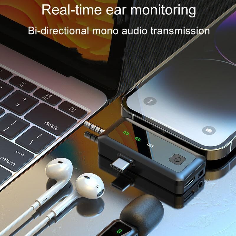 9. Real-time ear monitoring, two-way mono audio transmission, the equipment side can receive the wireless microphone end sound, wireless microphone end can receive the equipment side sound