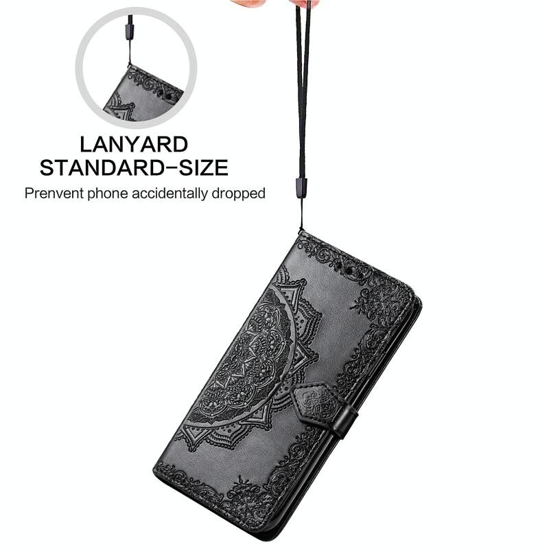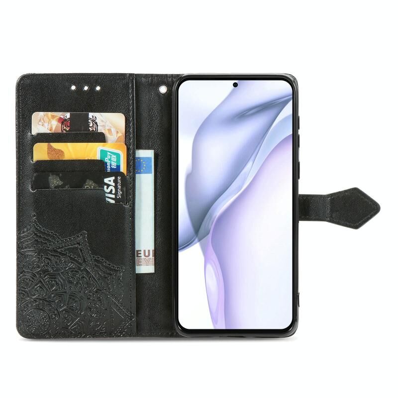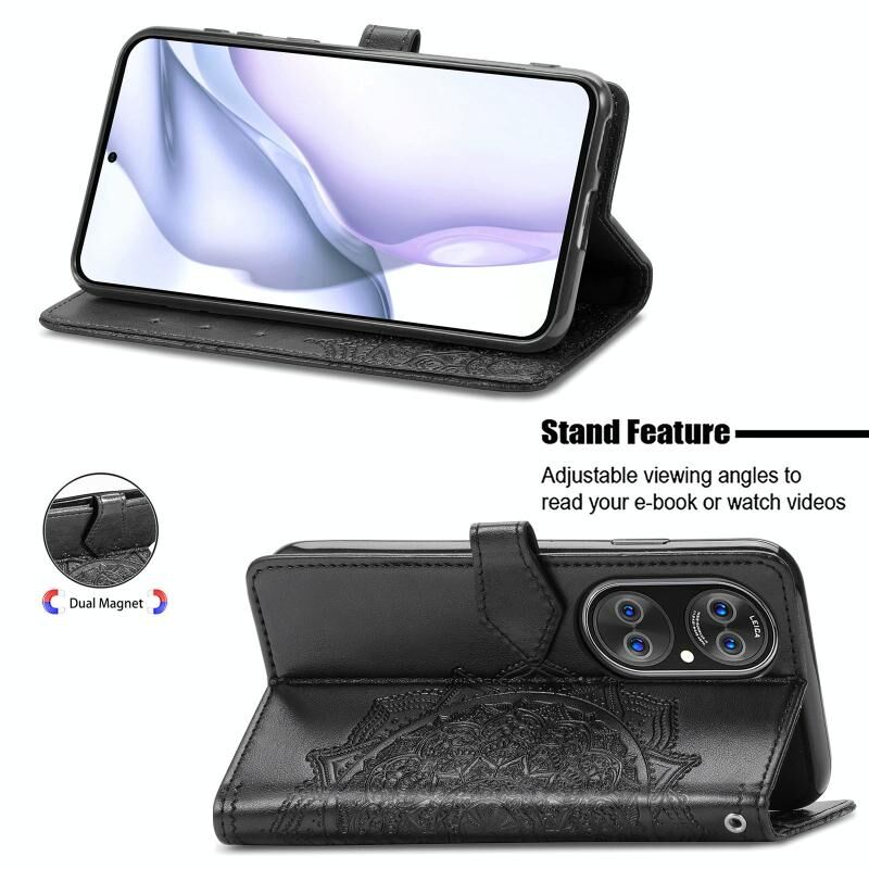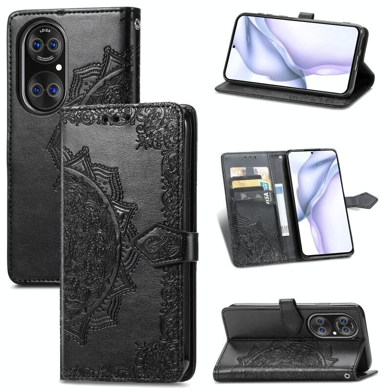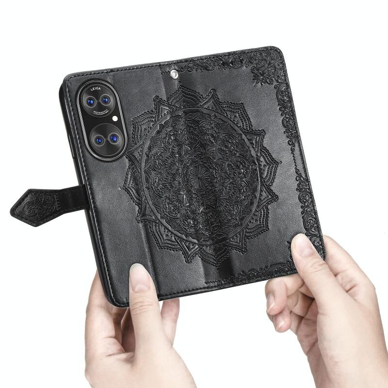 Δερμάτινη θήκη με ανάγλυφο μοτίβο μάνταλα (μισό), οριζόντιο άνοιγμα, βάση στήριξης, θήκες για κάρτες, πορτοφόλι και λουράκι για Huawei P50 Pro (Μαύρο)
