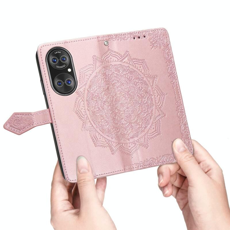 Δερμάτινη θήκη με ανάγλυφο μοτίβο μισού μαντάλα, οριζόντιο άνοιγμα, βάση στήριξης, υποδοχές καρτών, πορτοφόλι και λουράκι για Huawei P50 Pro (Ροζ Χρυσό)
