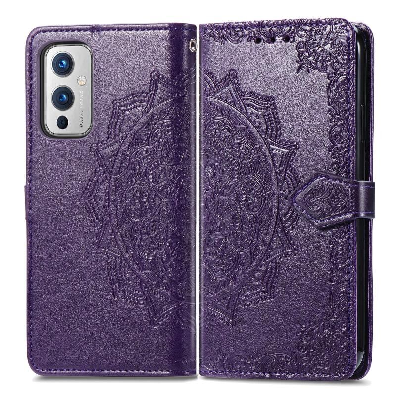 Halfway Mandala ανάγλυφο μοτίβο οριζόντια Flip δερμάτινη θήκη με κάτοχο & υποδοχές για κάρτες & πορτοφόλι & κορδόνι για OnePlus 9 (μωβ)