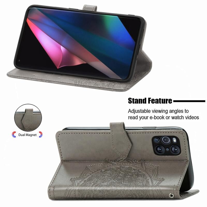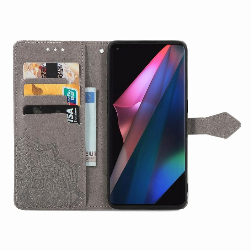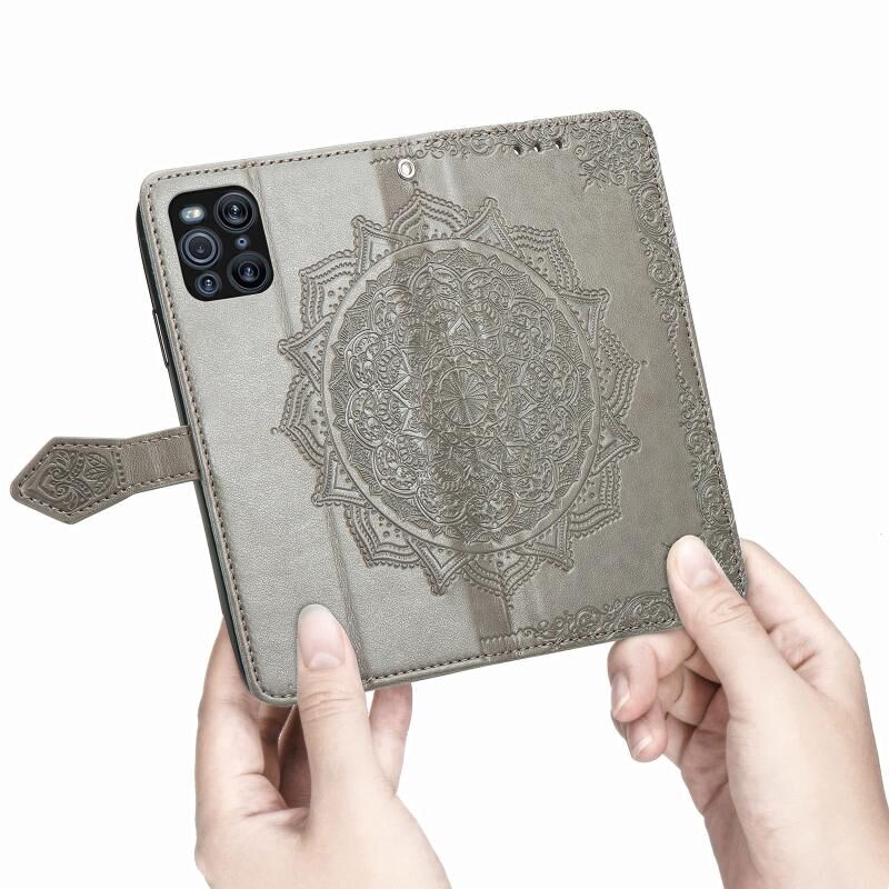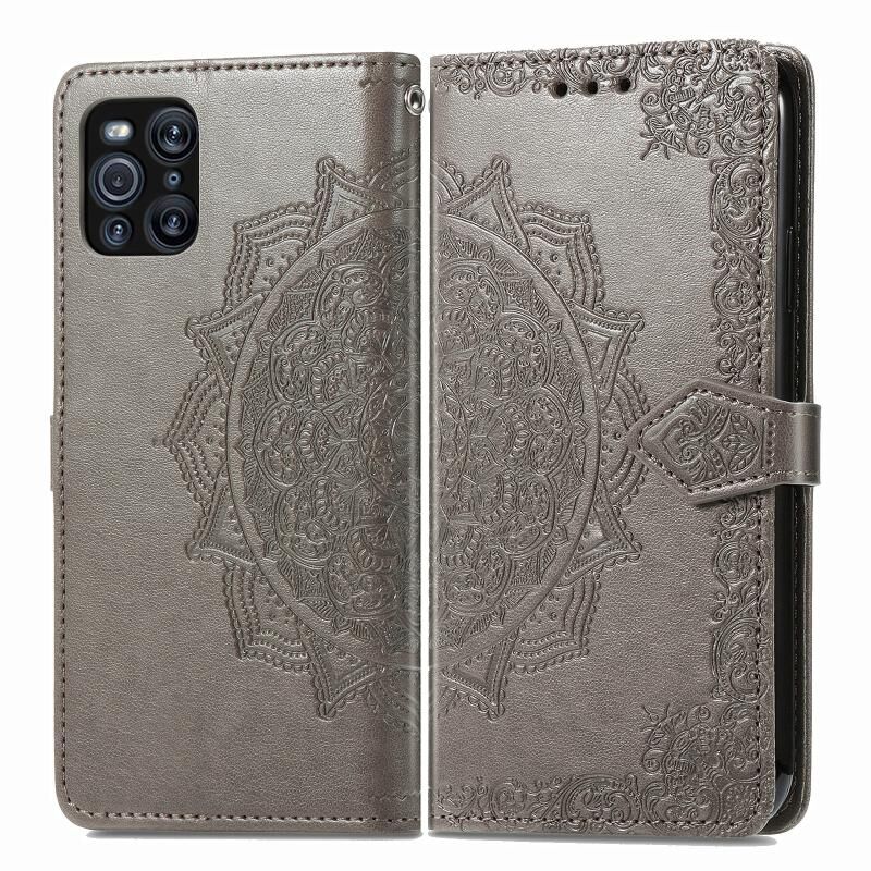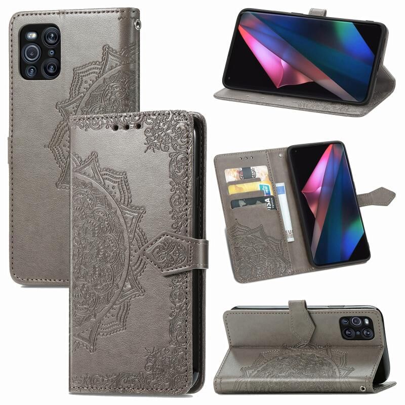 Halfway Mandala ανάγλυφο μοτίβο οριζόντια Flip δερμάτινη θήκη με κάτοχο & υποδοχές για κάρτες & πορτοφόλι & κορδόνι για OPPO Find X3 Pro (γκρι)