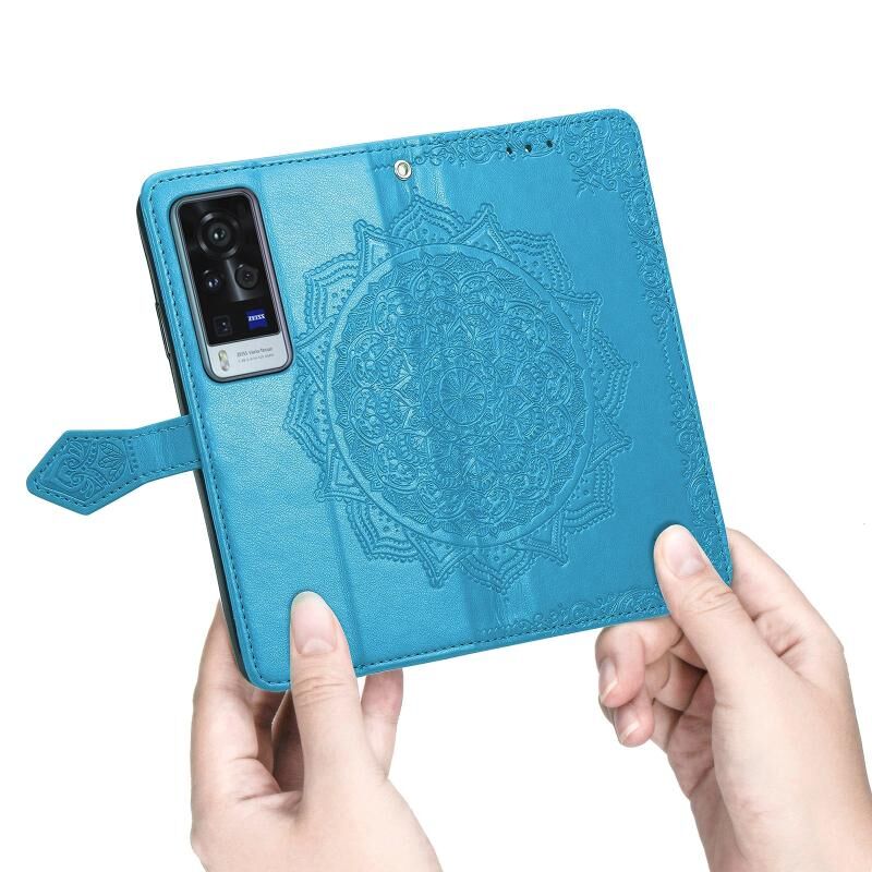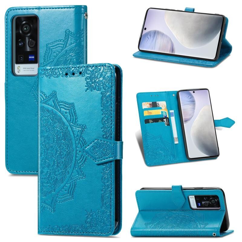 Halfway Mandala ανάγλυφο μοτίβο οριζόντια Flip δερμάτινη θήκη με κάτοχο & υποδοχές για κάρτες & πορτοφόλι & κορδόνι για το vivo X60 Pro (Μπλε)