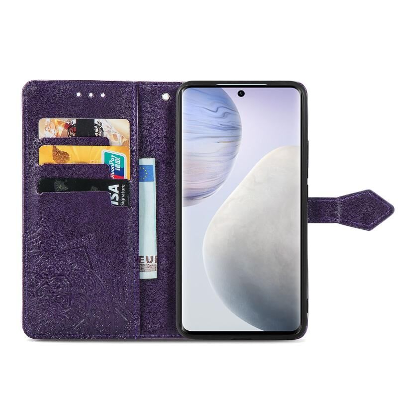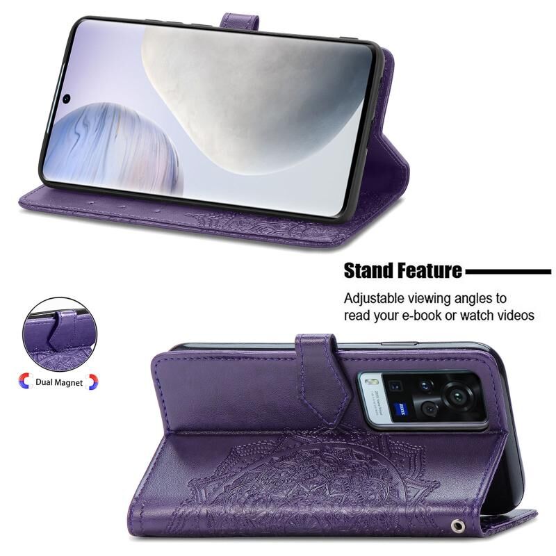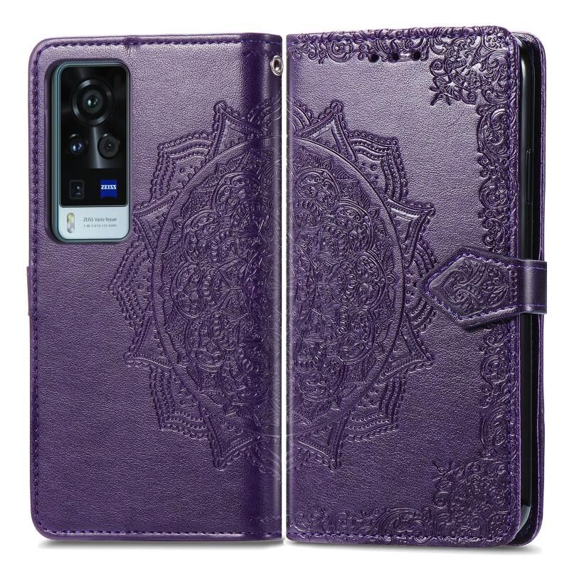 Halfway Mandala ανάγλυφο μοτίβο οριζόντια Flip δερμάτινη θήκη με κάτοχο & υποδοχές για κάρτες & πορτοφόλι & κορδόνι για το vivo X60 Pro (Μωβ)