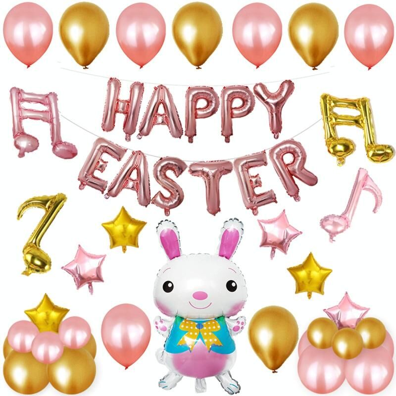 3. Products include: Rabbit balloon x1, 16 inch Happy Easter letter group x1, 12 inch golden balloon x13, rose golden balloon x13, 10 inch pink pentagonal balloon x3, golden balloon x3, Pink Double note x1, golden double note x1, pink single note x1, golden single note x1, ribbon tape x1