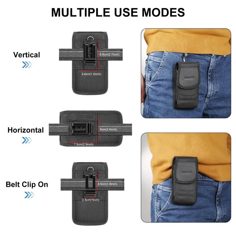 2. Cell phone holster case with belt loop, metal belt clip and carabiner hook; 4 different ways to wear: Vertical / horizontal / clip on / climbing hook. 1 card slot and extra pen slot can suit for your valuables.