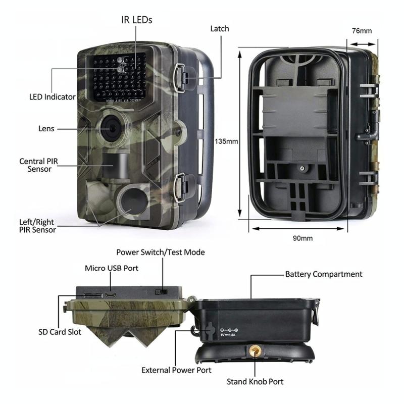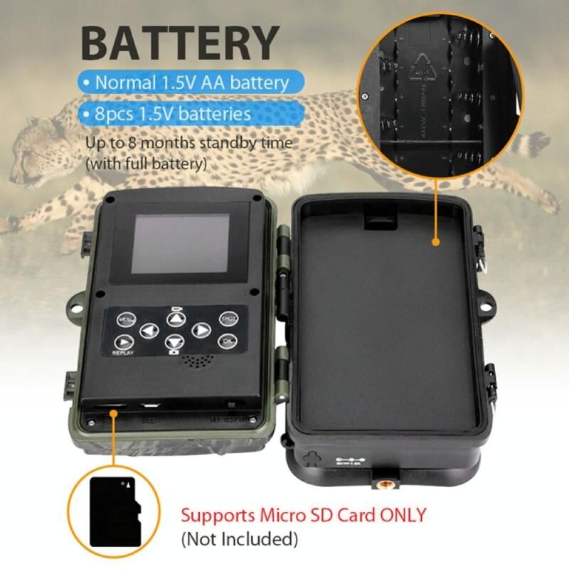 2.1080P 120 degree HD PIR sensor camera, support 20MP / 16MP / 24MP selectable image resolution, 1080P video. Infrared camera surveillance for wild animals.