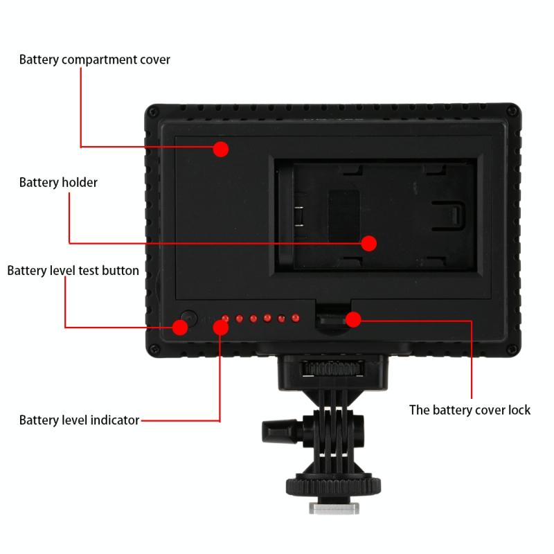 7. Power by 6 x AA Batteries or 6 x Hi-MH Batteries or Panasonic CGR-D16S/D220 Battery, or Sony F570/F770/F970 Battery (note: all the Batteries are not included).
