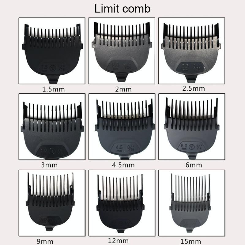 7. Products include: 1.5mm, 2mm, 2.5mm, 3mm, 4.5mm, 6mm, 9mm, 12mm, 15mm limit comb, small oil bottle, small brush, charging cable, instruction manual, hair clipper, cloth, sponge