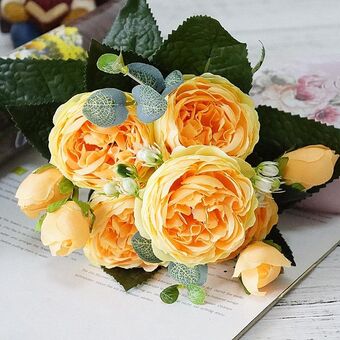 Beautiful Rose Peony Artificial Silk Flowers Small Bouquet Fores Home Party Spring Wedding Decoration Fake Flower(Orange)