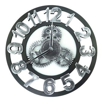 Ρετρό ξύλινο στρογγυλό μονόπλευρο ρολόι με γρανάζια Ρωμαϊκό ρολόι τοίχου, διάμετρος: 35cm (ασημί)