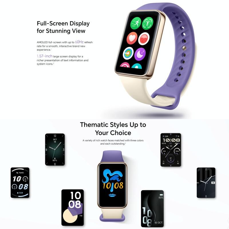 1. AMOLED full-screen with up to 60Hz refresh rate for a smooth, interactive brand new experience. 1.57-inch large screen display for a richer presentation of text information and system icons.