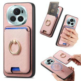 For Honor Magic6 Pro 5G Retro Cross Leather Ring Vertical Insert Card Bag MagSafe Phone Case(Pink)