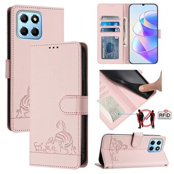 For Honor 70 Lite 5G Global/X6s 4G Global Cat Rat Embossed Pattern RFID Leather Phone Case with Lanyard(Pink)