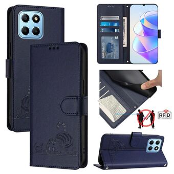 For Honor 70 Lite 5G Global/X6s 4G Global Cat Rat Embossed Pattern RFID Leather Phone Case with Lanyard(Blue)