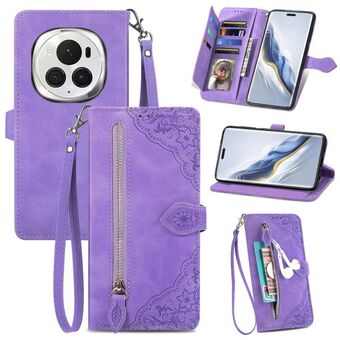 Για Honor Magic6 Pro ανάγλυφο λουλούδι φερμουάρ δερμάτινη θήκη τηλεφώνου (μωβ)