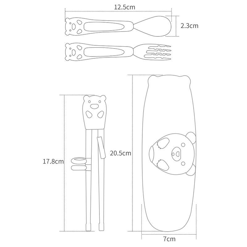 8. Dimensions: spoon and fork 12.5x2.3 cm, chopsticks 17.8 cm long, dust box 20.5x7 cm