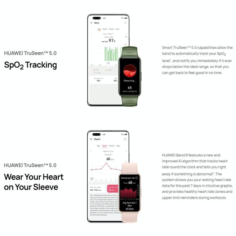 4. HUAWEI Band 8 features a new and improved AI algorithm that tracks heart rate round the clock and tells you right away if something is abnormal. The system shows you your resting heart rate data for the past 7 days in intuitive graphs, and provides healthy heart rate zones and upper limit reminders during workouts.