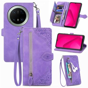 For Huawei Mate 70 Pro Embossed Flower Zipper Leather Phone Case(Purple)